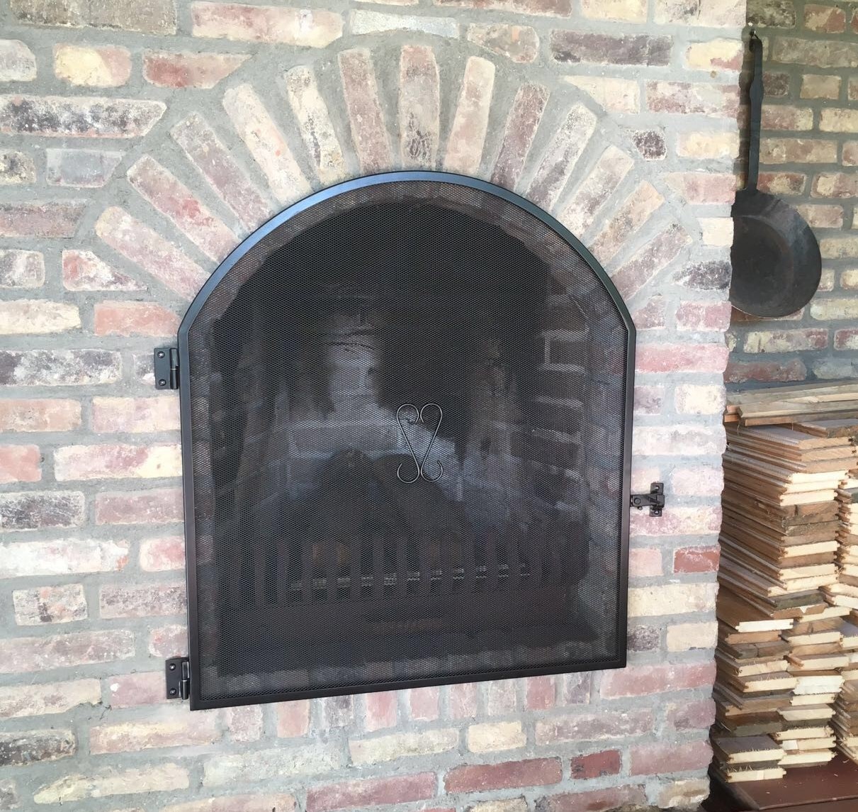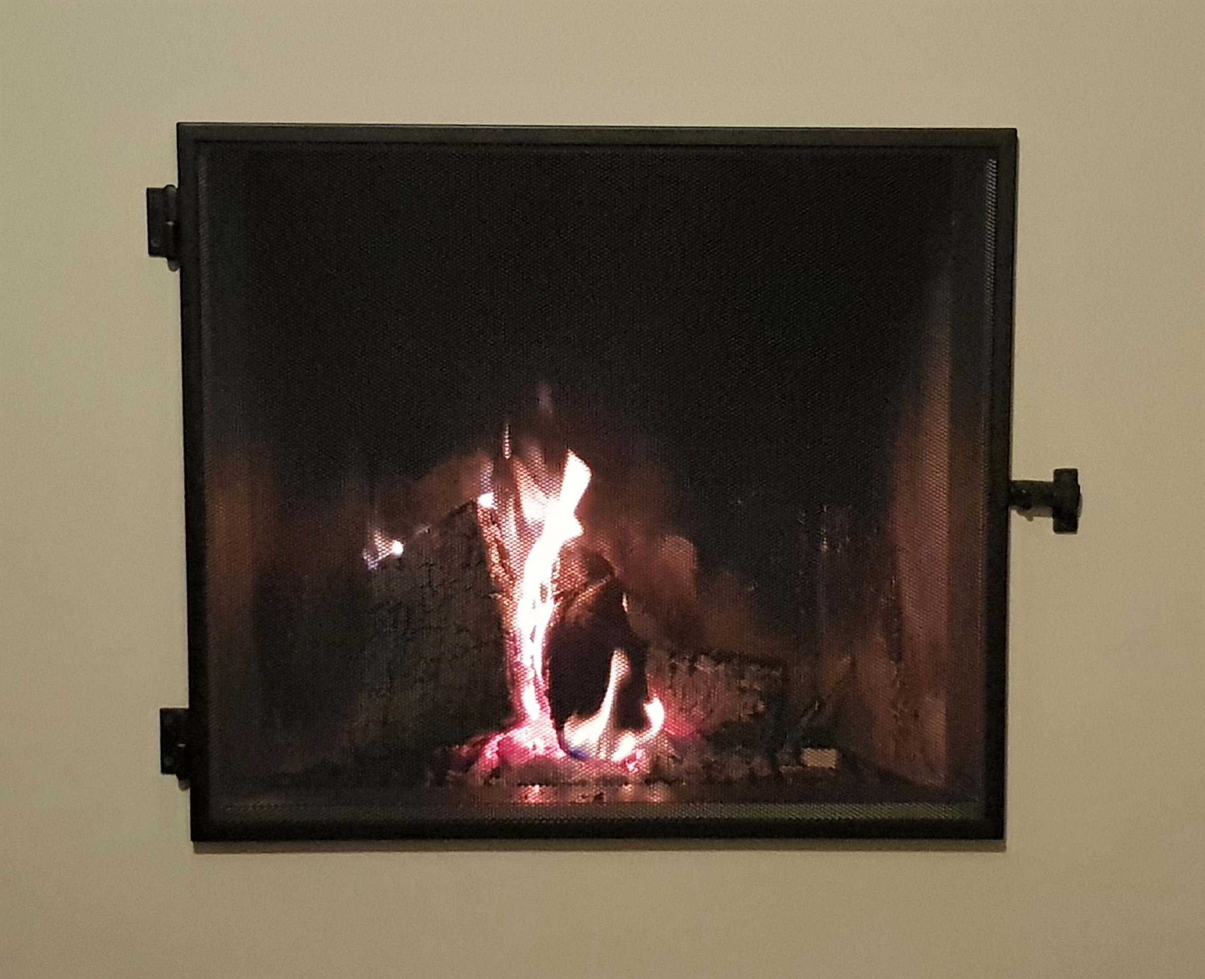 Een inwendige haardschermdeur valt in de opening van de openhaard.