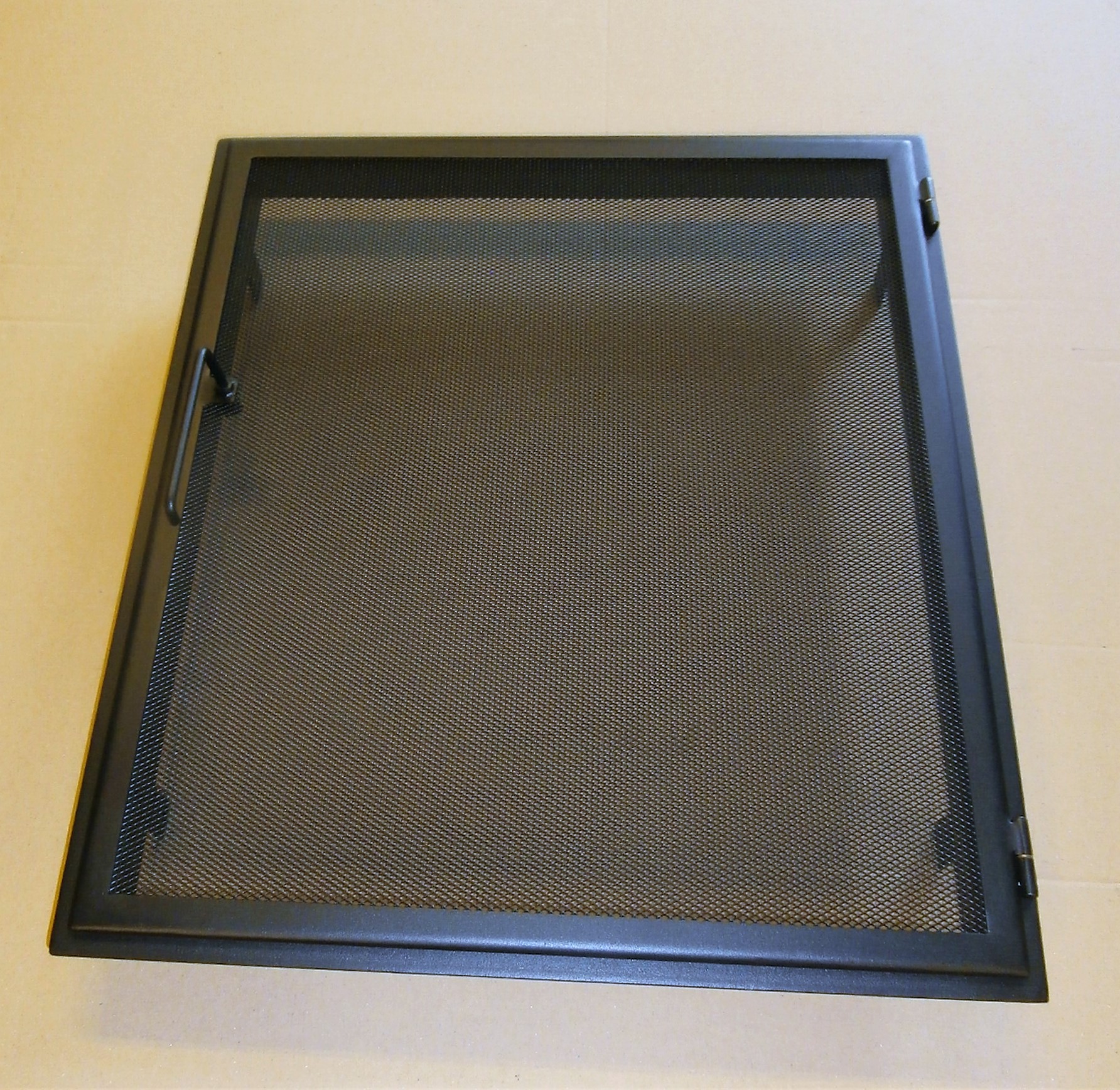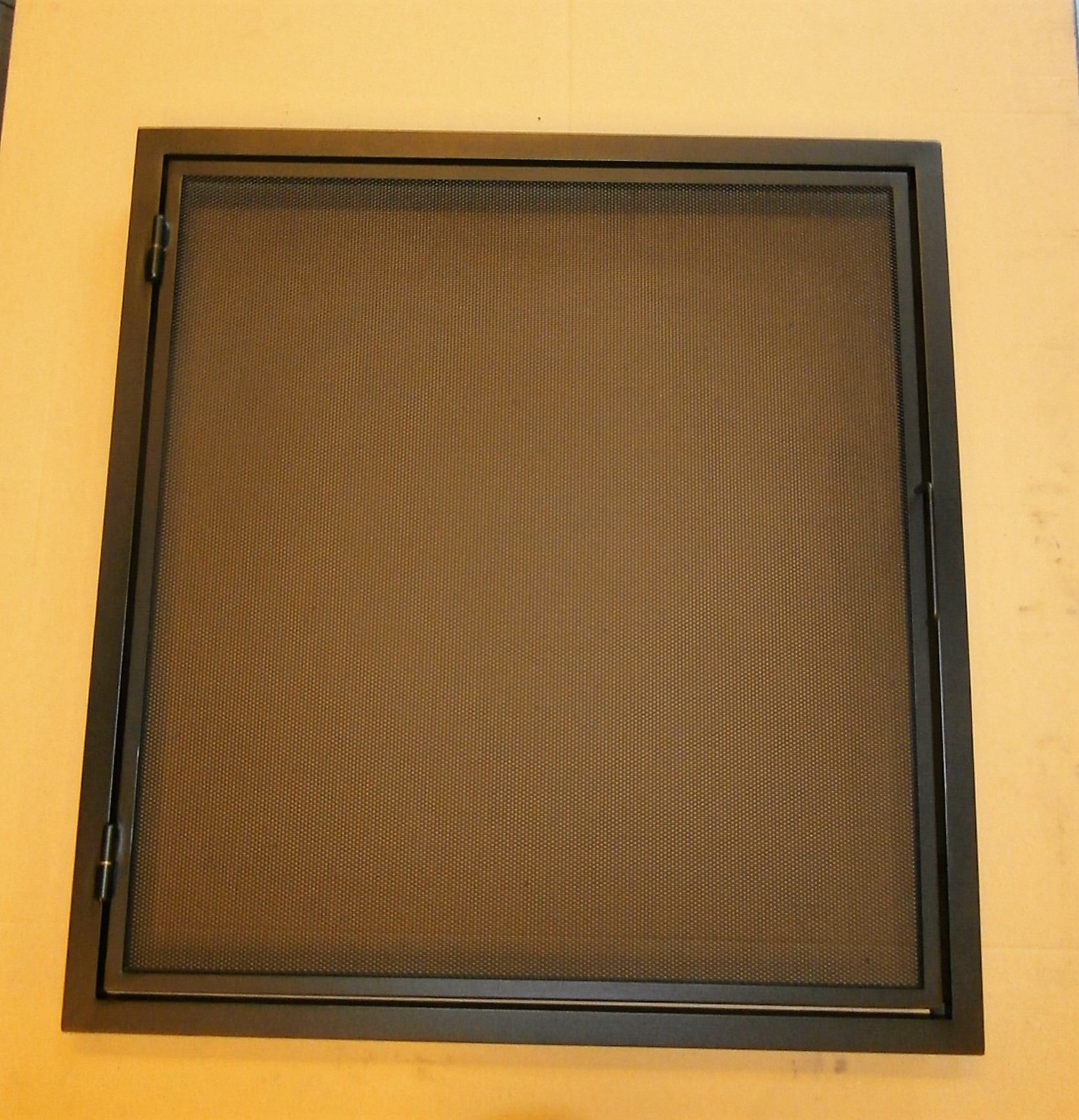 Een haardschermdeur op of in een frame, het frame komt tegen de voorkant van de opening van de openhaard.