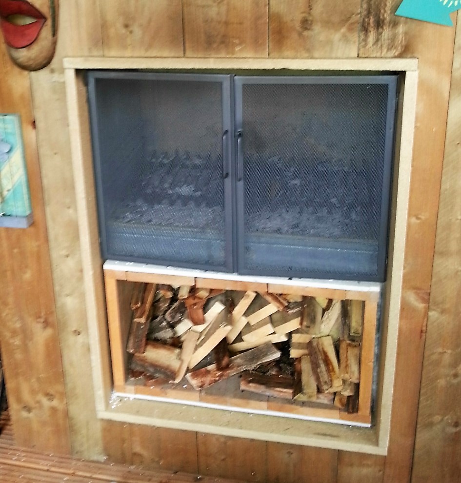 Een uitwendige haardschermdeur komt tegen de muur voor de open haard.